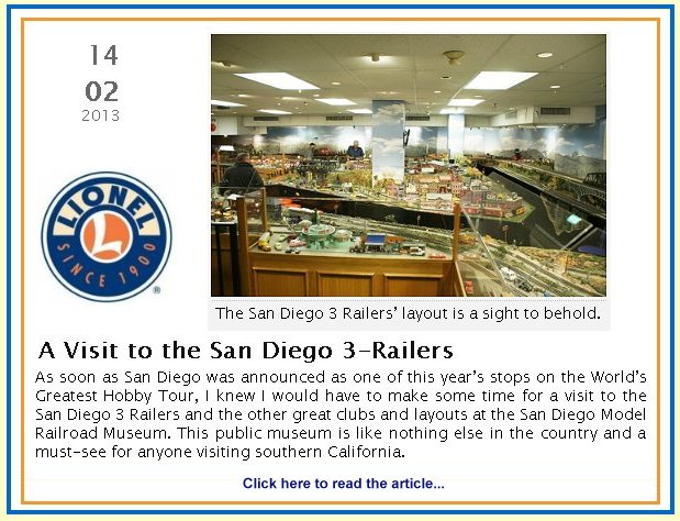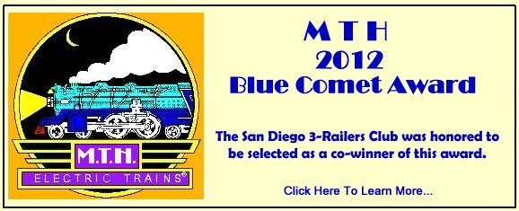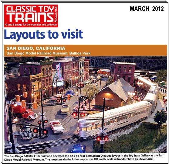 Enlarge the image by clicking on .. ![]() ![]() The San Diego 3-Railers at the San Diego Model Railroad Museum were pleased to be recognized by Classic Toy Trains Magazine as one of the " Layouts to visit " in their March 2012 issue. Click here to read the article... *** SD3R News ***